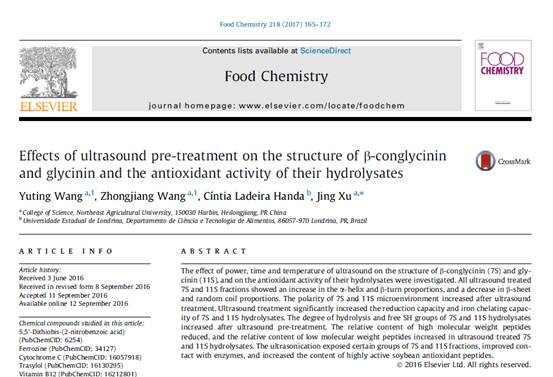 由公司2016届应用化学专业硕士研究生王昱婷为第一作者、许晶教授为通讯作者的高被引论文《Effectsof ultrasound pre-treatment on the structure of β-conglycinin and glycinin andthe antioxidant activity of their hydrolysates》,以大豆浸油的副产物脱脂豆粕为原料,制备β-大豆伴球蛋白和大豆球蛋白,研究超声处理对β-大豆伴球蛋白和大豆球蛋白结构及其酶解产物抗氧化活性的影响,探究超声辅助酶水解影响大豆蛋白抗氧化活性的作用机制。该研究充分利用了大豆油加工副产品、提高了大豆制品附加值,为开发抗氧化活性功能食品提供依据。近年来,许晶教授领导的生物大分子结构调控与功能特性研究学科团队以生物大分子为研究对象,运用化学的理论和方法及现代物理学的测试手段,对其在食品、医药及生物载体等领域的应用进行研究,取得了一系列的创新性研究成果,近三年主持各类课题13项,获得国家发明专利4项,发表三大检索论文23篇(IF总计44.24)。