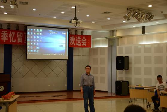 欢送会开始,一段精心准备的视频勾起了大家对老员工活的无尽回忆及对母校和学院的眷恋不舍之情。随后,理公司党委书记刘振忠教授上台致辞,提出对毕业生们的殷切希望。而大一同学们满载着祝福的歌声与朗诵则引起了大家对未来生活的无限向往。在台下观众热烈的掌声和呐喊声中,欢送会迎来了最精彩也是最动情的部分――毕业生们的“表白”,每位同学都上台讲述了属于自己的老员工活,或充实,或欢乐,但都是难忘的。在这热闹的气氛中,一丝伤感与不舍慢慢的弥散开来。最后辅导员钱振宁老师上台讲述了毕业生们给他留下的美好回忆及表达了对他们的鼓励及祝福。