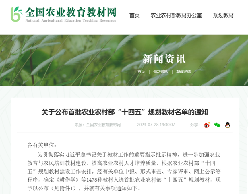 首批农业农村部“十四五”规划教材入选名单公示