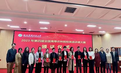 11月10日,第四届全国高等农林院校英语讲课大赛总决赛以及2023年全国高等农林院校外语教学研究会年会在西北农林科技大学落下帷幕。该年会旨在贯彻党的二十大精神,将优秀农耕文化融入农林高校文化,引导涉农院校师生用英语讲好中华农耕文化故事,加强各高等农林院校外语学院间的交流合作,推动高校外语教学改革。